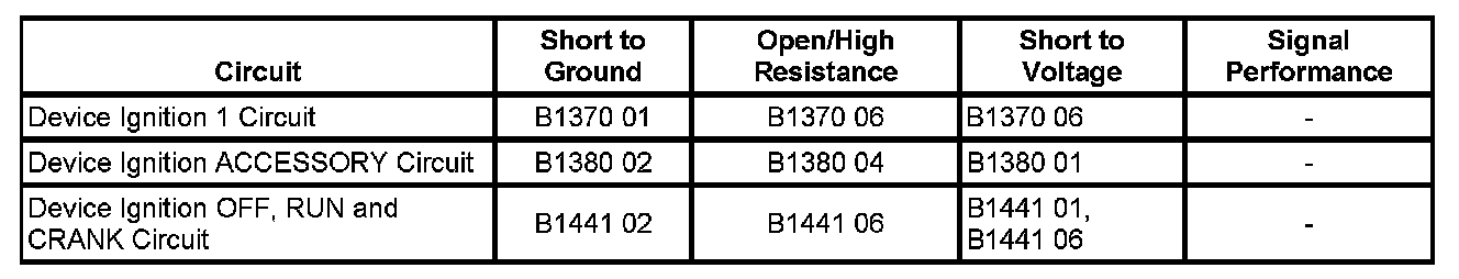 5. Ignition key out, test for less than 1-volt between the circuit terminals listed below and ground: