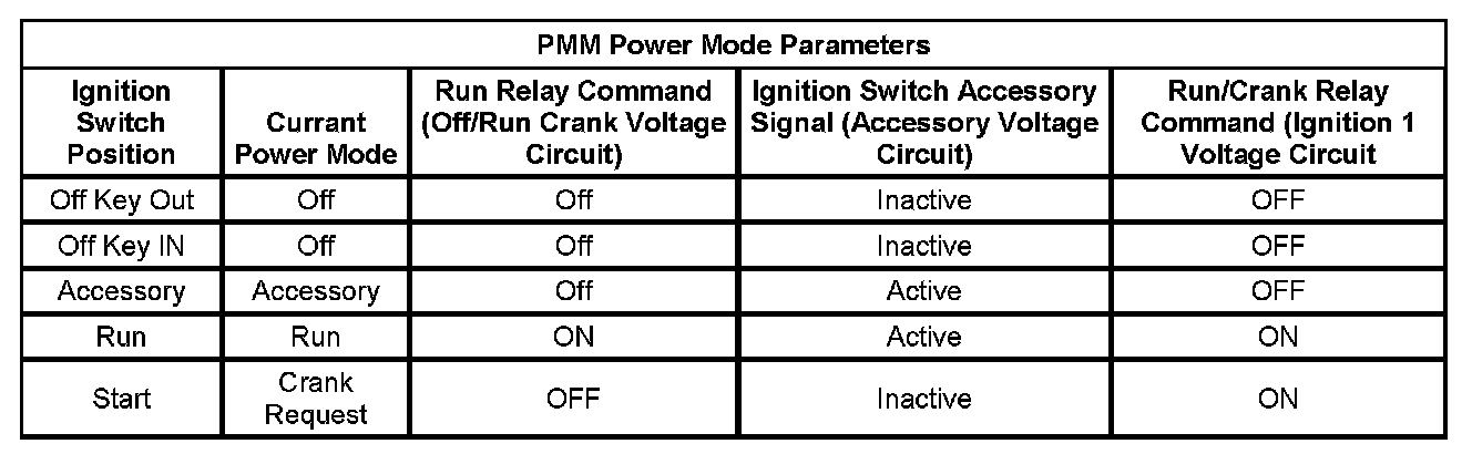 With a scan tool, access Body Control Module, Power Mode data display list and compare all parameters listed with the corresponding ignition key position. The PMM Power Mode Parameters table below illustrates the correct state of these input parameters (circuits) in correspondence to the ignition switch position. The circuits which the individual parameters are related to are in parentheses.