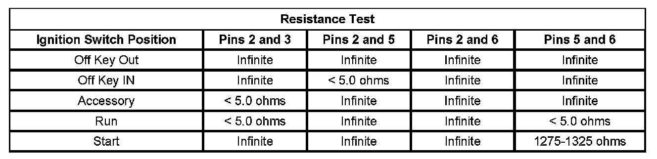 Using the Resistance Test below, check the resistance between the pins of the ignition switch listed in each switch position listed.