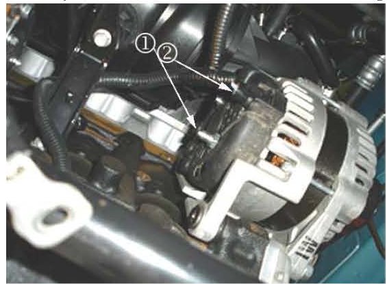 4. Disconnect the B+ terminal (1) and the regulator connector (2).