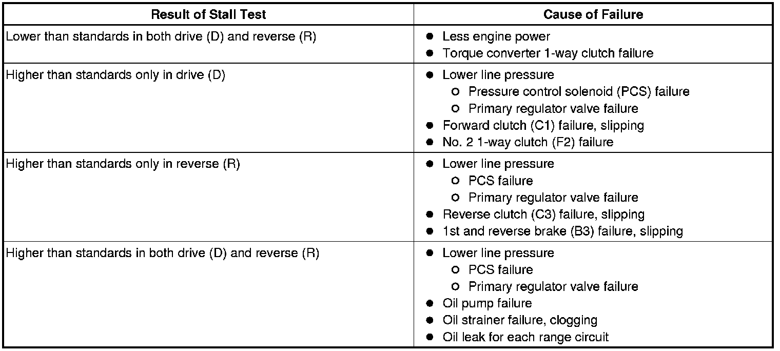 The purpose of the stall test is to inspect the overall performance of the automatic transmission (A/T) and the engine by measuring the stall speed in drive (D) and reverse (R) range.