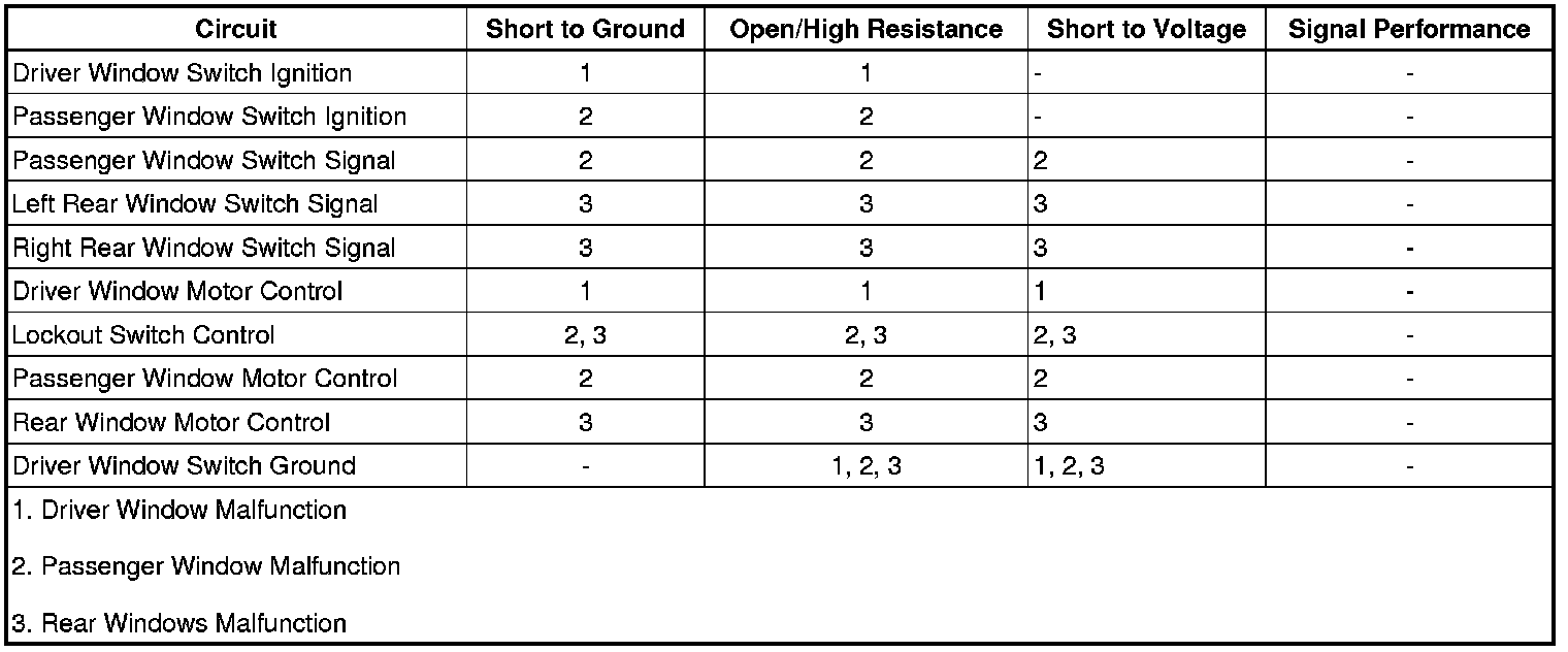 • If the test lamp is always OFF, test the control circuit for a short to ground or an open/high resistance. If the circuit tests normal, test or replace the driver window switch.