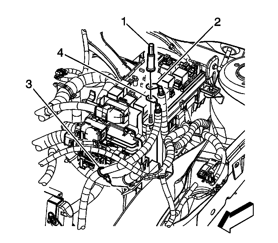 4. Remove the positive battery cable terminal (2) from the junction block stud.