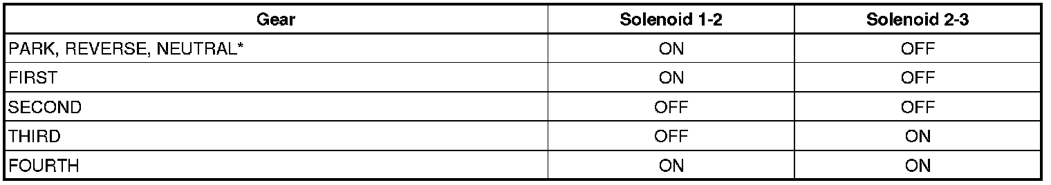 *Important: The solenoid states are normally ON (1-2) and OFF (2-3) in the P, R, and N gears. However, these may change based on the vehicle speed and the throttle position.