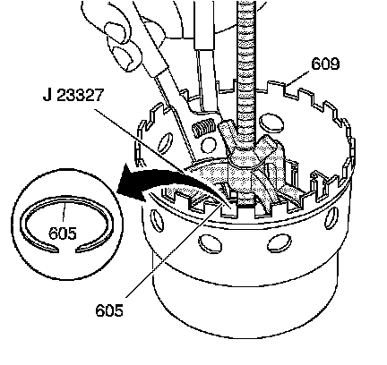5. Assemble the snap ring (605) in order to retain the forward clutch return spring.