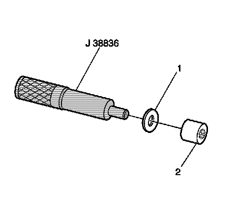 1. Install a 5/8 inch washer (1) onto the J 38836 or equivalent. The washer serves as a stop against the crankshaft face and will assist in installing the bearing to the proper depth.
