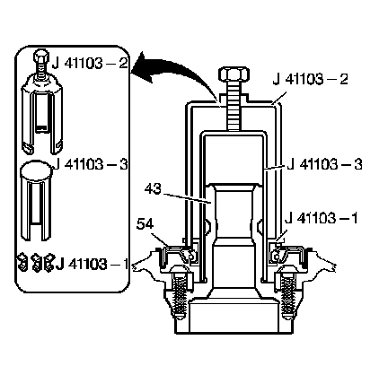 4. Tighten the forcing screw on the J 41103-2 - puller bridge until the J 41103-1 - puller legs remove the torque converter seal (54).