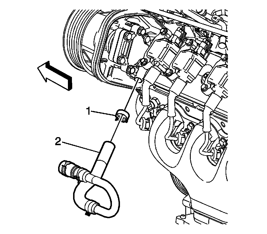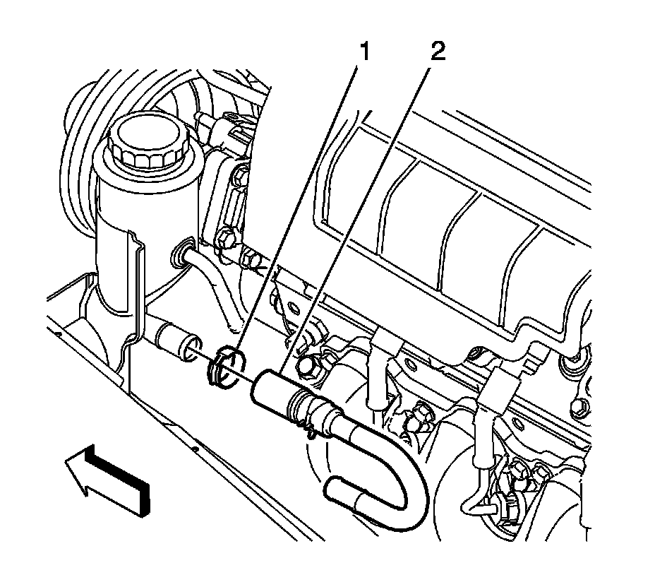 1. Position the power steering fluid reservoir inlet hose (2) to the vehicle.