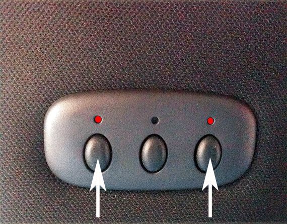 Customers should be advised to first reset the Universal Home Remote System buttons on their car. This is accomplished by pushing and holding the two outside buttons (white arrows in photo) located on the driver's side sunvisor for approximately 20 seconds. The lights will not illuminate at this time.