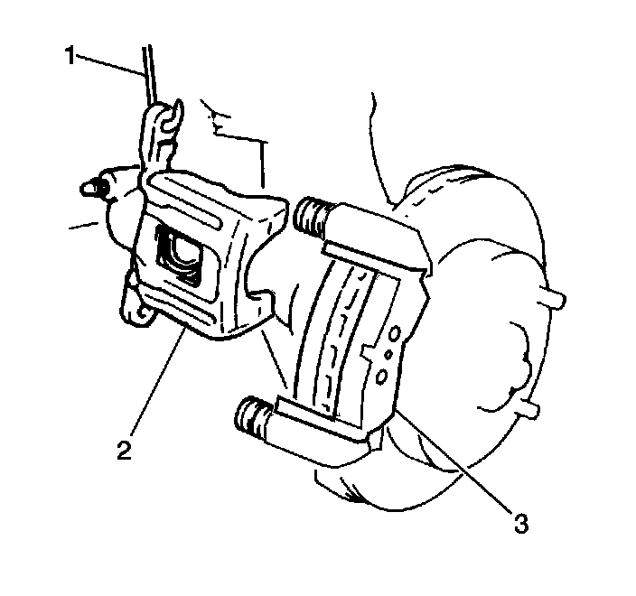 1. Remove the brake caliper from the mounting bracket and support the brake caliper (2) with heavy mechanics wire (1), or equivalent. Do NOT disconnect the hydraulic brake flexible hose from the caliper. Refer to Rear Brake Caliper Replacement (JL9, J55) (Rear Brake Caliper Replacement (JL9, J55))Rear Brake Caliper Replacement (J56) (Rear Brake Caliper Replacement (J56))Rear Brake Caliper Replacement (J57) (Rear Brake Caliper Replacement (J57)).