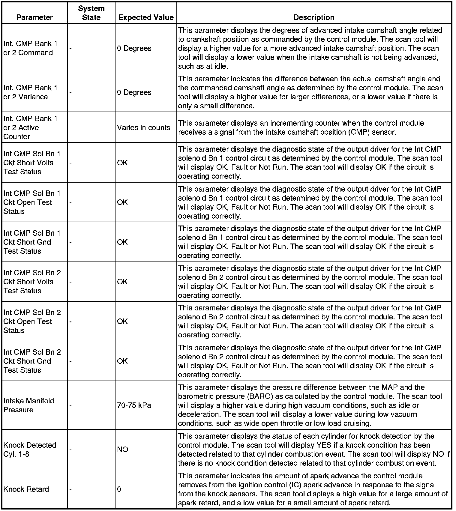 The scan tool values from a properly running engine may be used for comparison with the engine you are diagnosing. The engine scan tool data list represents values that would be seen on a normally running engine.