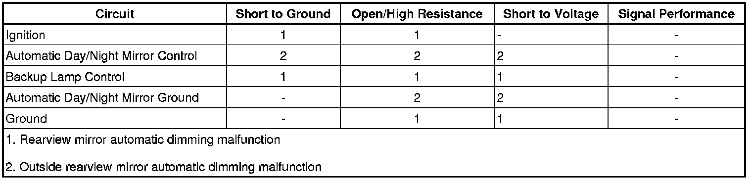 With the gear selector lever in the REVERSE position, backup lamp supply voltage is supplied as an input to the inside rearview mirror. The mirror monitors this input to disable the automatic day-night feature. This allows the driver to see objects in the mirror clearly when backing up, regardless of the rear light sensor status.