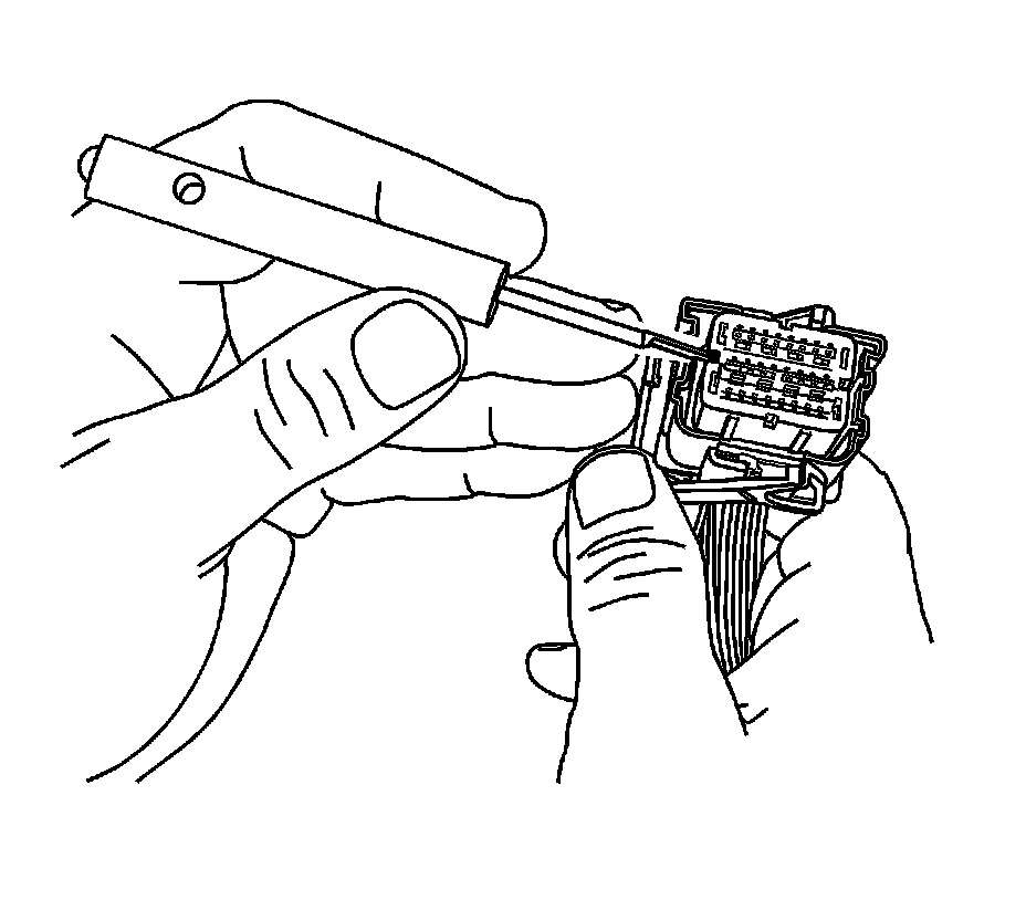 6. Using terminal release tool J-38125-215A, place the tip of the tool on the outside edge next to the terminal and depress the lock tab and remove the rear of the connector body.