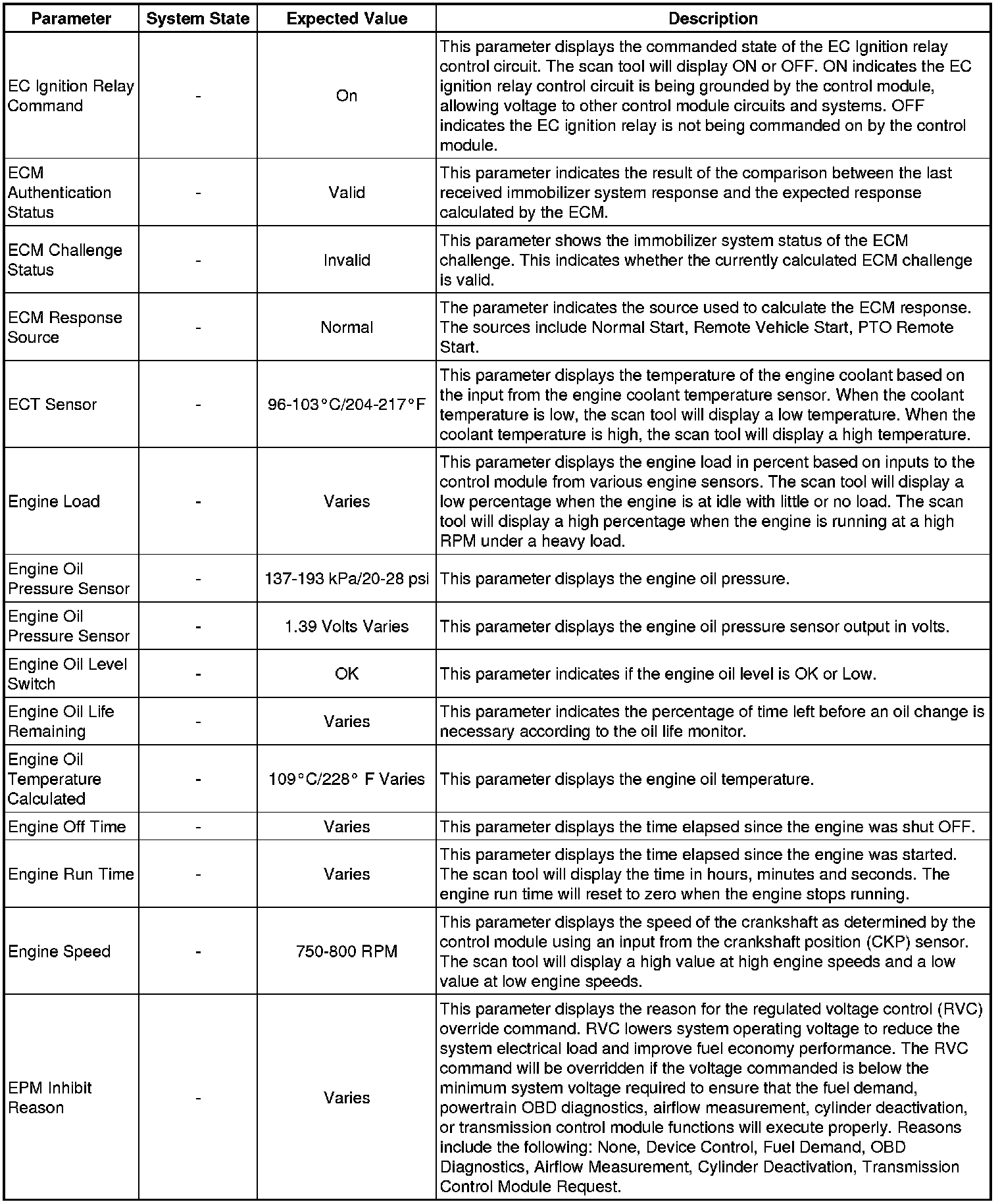 The Engine Control Module Scan Tool Data List contains all engine-related parameters that are available on the scan tool. The list is arranged in alphabetical order. A given parameter may appear in any one of the data lists, and in some cases may appear more than once, or in more than one data list in order to group certain related parameters together.