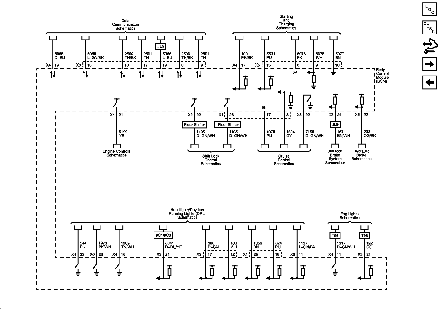 Data Link, Starting and Charging, Engine Controls, Shift Lock Control, Cruise Control, ABS, Brake Warning, Headlights/DRL, and Fog Lights References