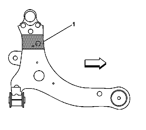 When lifting the vehicle with a suspension-contact lift, place the front post lift points at the lower control arms in the area shown (1). Lift the rear of the vehicle with the rear post lift points ONLY under the rear wheels.