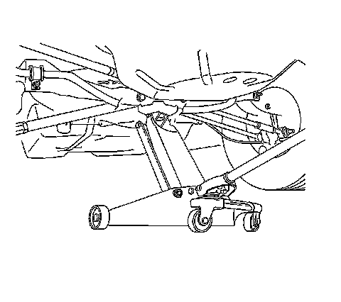 Lift the rear of the vehicle by placing the floor jack lift pad at the center of the rear suspension.