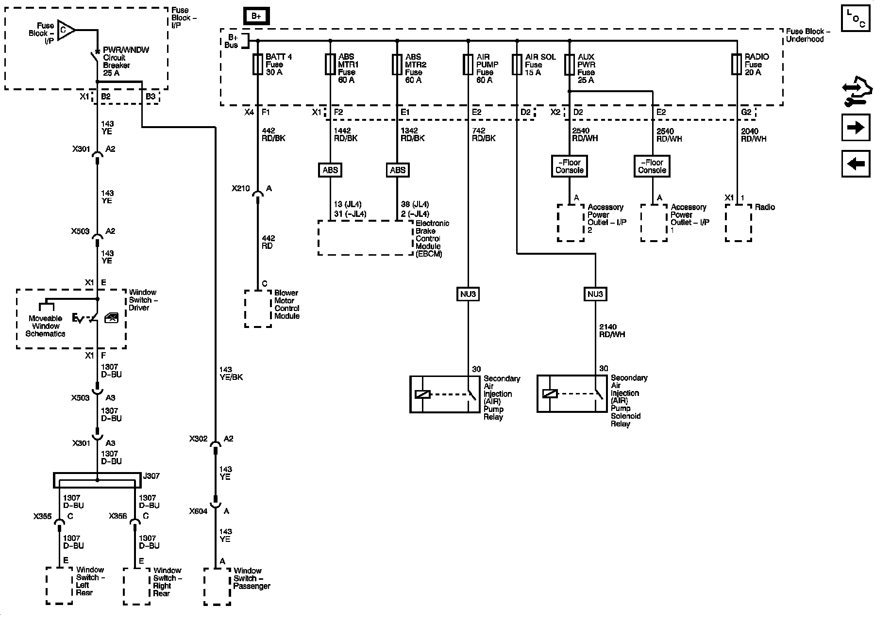 BATT 4, ABS MTR1, ABS MTR2, AIR PUMP, AIR SOL, AUX PWR, RADIO Fuses, and PWR/WNDW Circuit Breaker