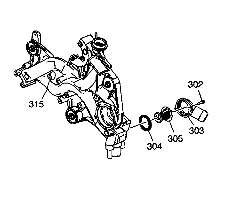 1. Install the thermostat (305), O-ring (304), inlet housing (303), and bolts (302) and tighten the bolts to 15 Nm (11 lb ft).