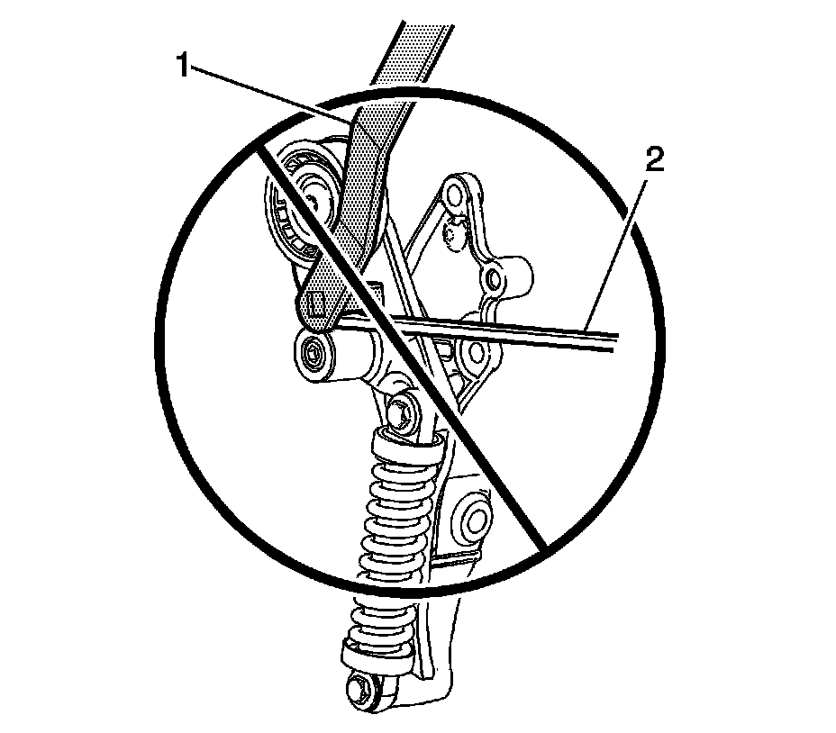 2. Ensure that when installing the EN-47988 (1), to the belt tensioner that the EN-47988 is NOT installed above the drive belt (2).