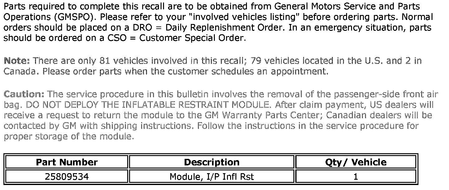 2. Do NOT deploy the inflatable restraint module. After claim payment, US dealers will receive a request to return the module to the GM Warranty Parts Center; Canadian dealers will be contacted by GM with shipping instructions. Follow the above instructions for proper storage of the module.