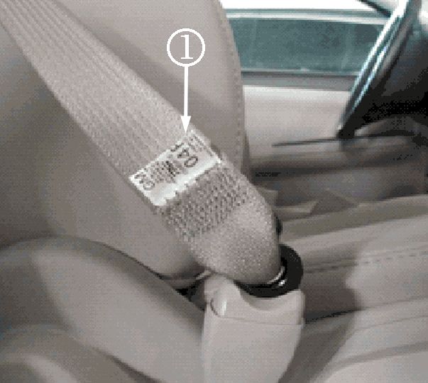 If the seat belt label (1) is facing the front door of the vehicle, the seat belt and anchor pretensioner are incorrectly installed. The seat belt label must face the seat back.