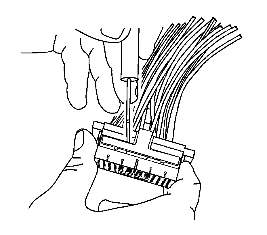 16. Using terminal release tool J-38125-560, press the prongs into the holes on each side of the terminal to be removed to release the lock tabs and pull the terminal out of the connector body.