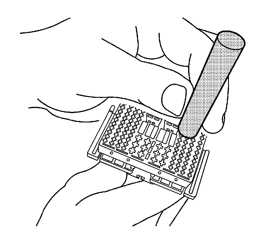 14. Using terminal release tool J-38125-221, press the prongs into the holes on each side of the terminal to be removed to release the lock tabs and pull the terminal out of the connector body.
