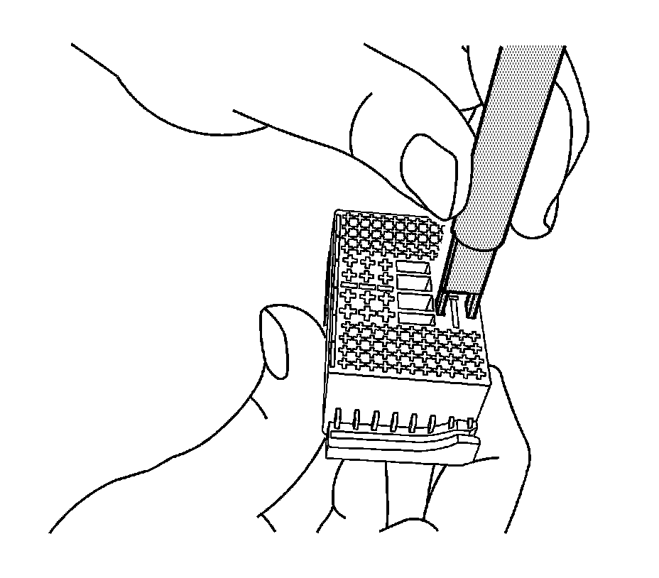 15. Using terminal release tool J-38125-212, press the prongs into the holes on each side of the terminal to be removed to release the lock tabs and pull the terminal out of the connector body.
