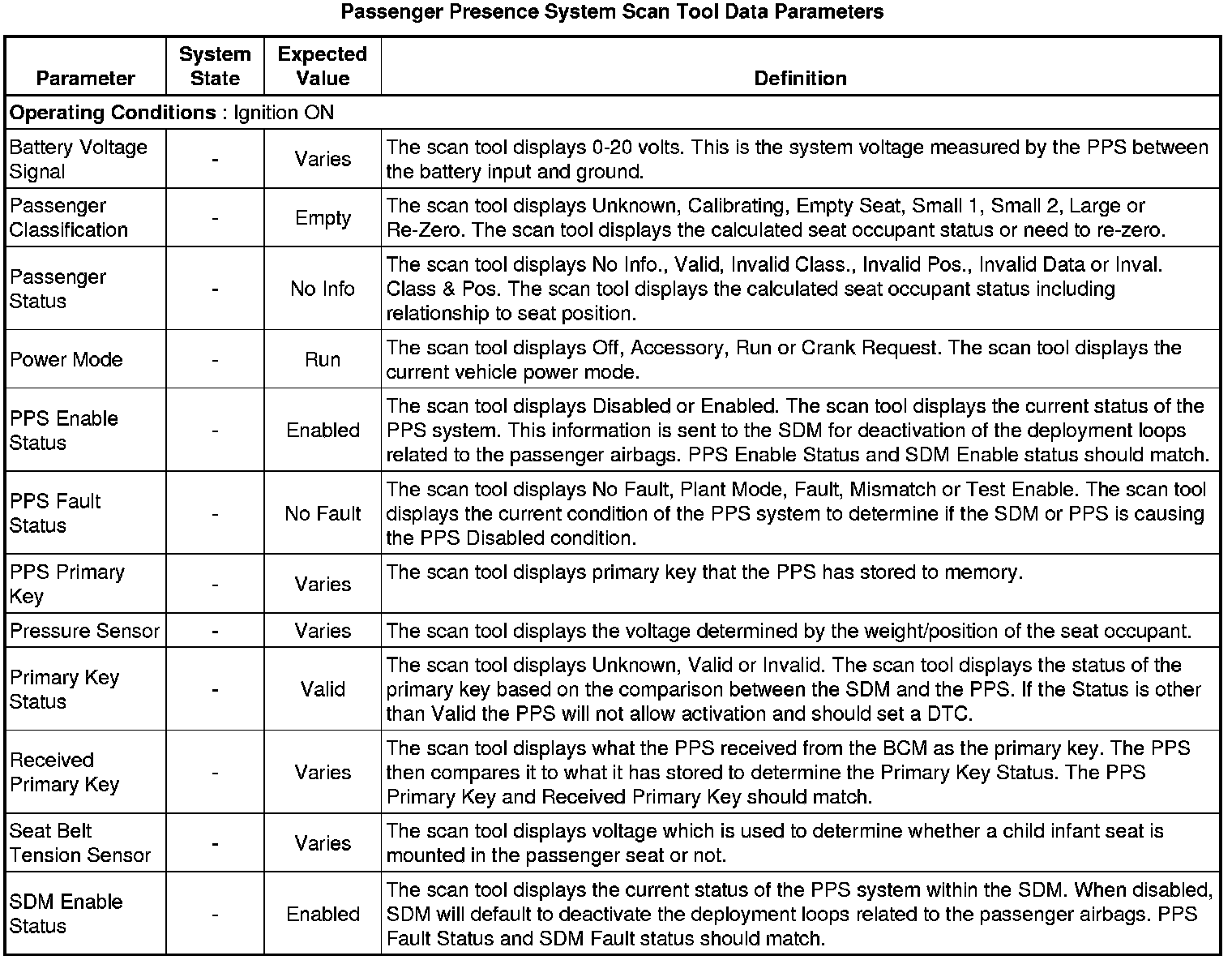 Inflatable Restraint Passenger Presence System Scan Tool Information