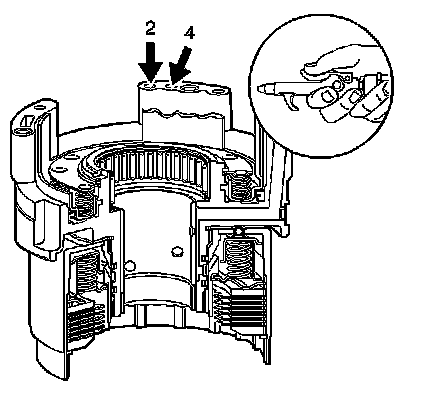 2. Apply 138 kPa (20 psi) to the feed holes marked 2 and 4, and listen for the second and fourth clutches to apply.