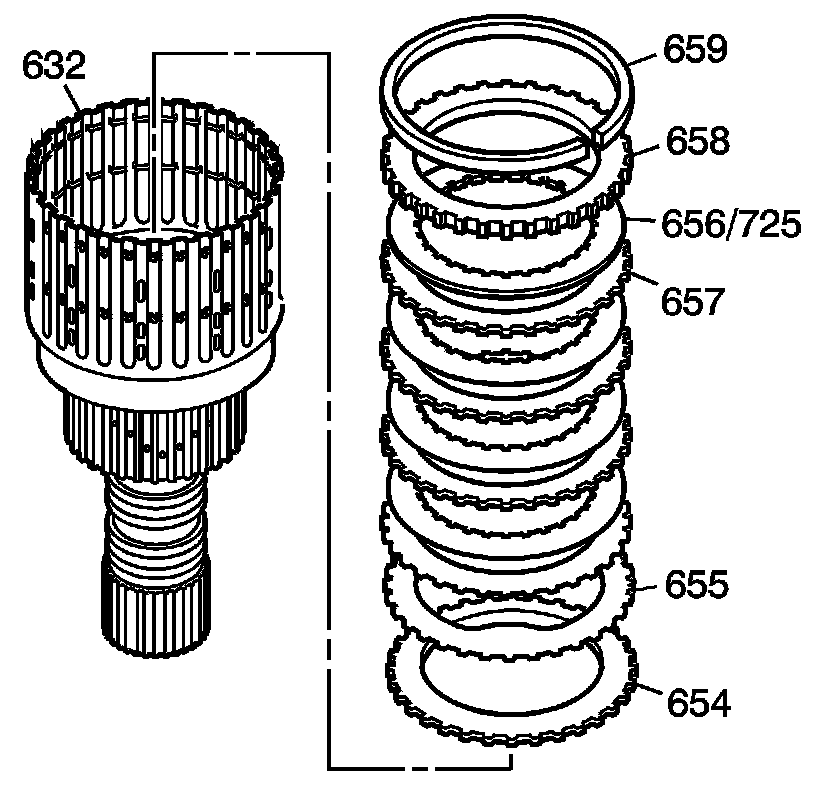 23. Install the input clutch plates (656/725, 657) starting with an input clutch steel plate (657) and alternating with input clutch fiber plate assemblies (656).