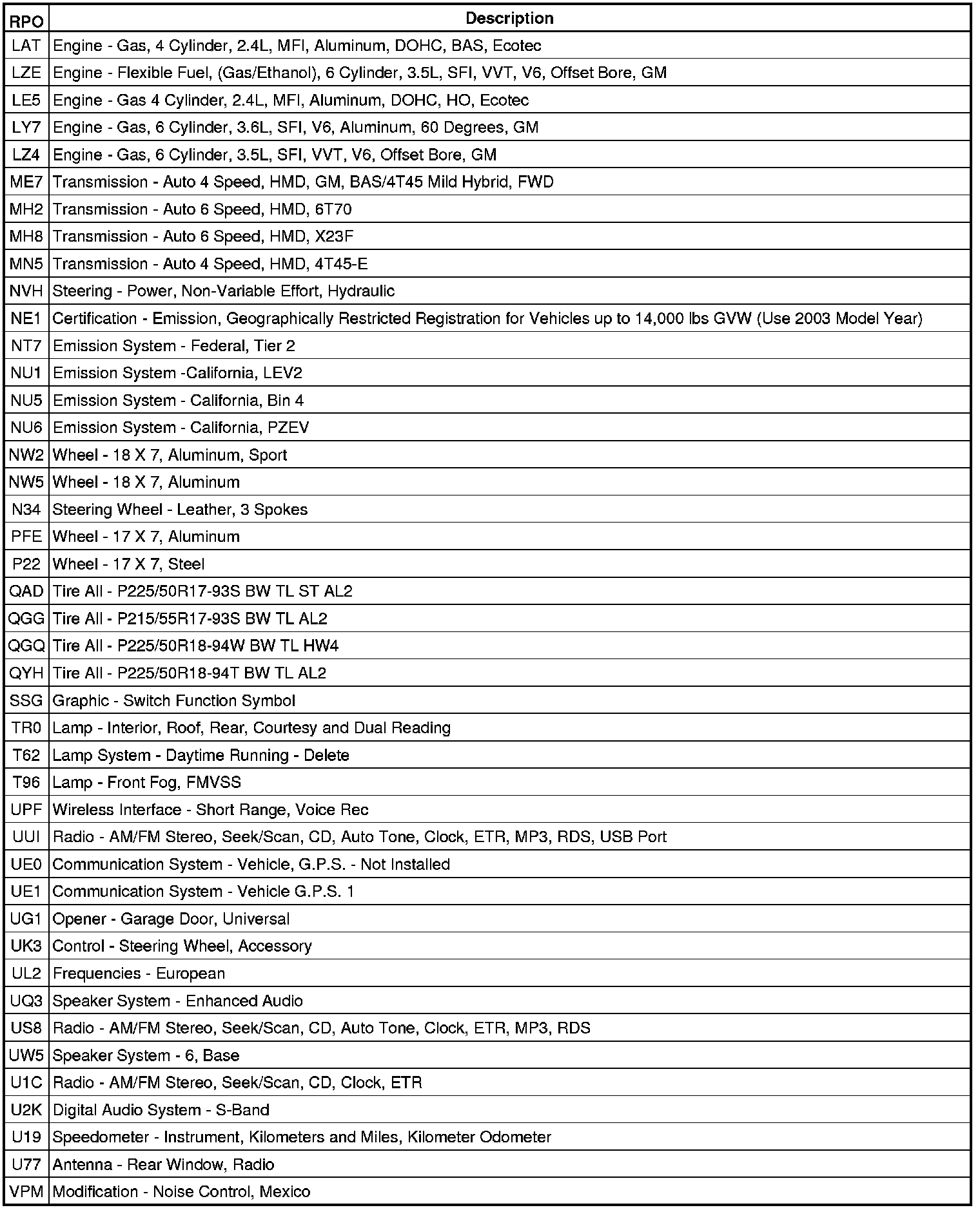 The following table provides the description of the Regular Production Option (RPO) codes that are available on the vehicle. The vehicle's RPO list is printed on the Service Parts Identification Label.