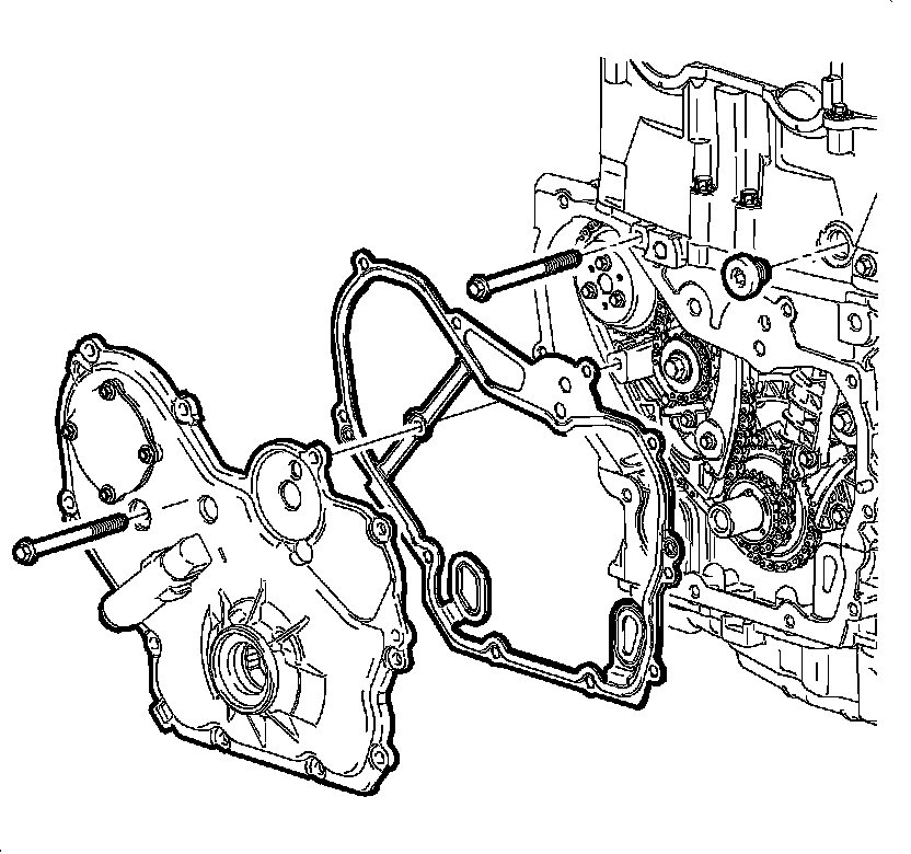 6. Install the access cover bolts that were removed earlier to secure the water pump holding tool to the front cover assembly.