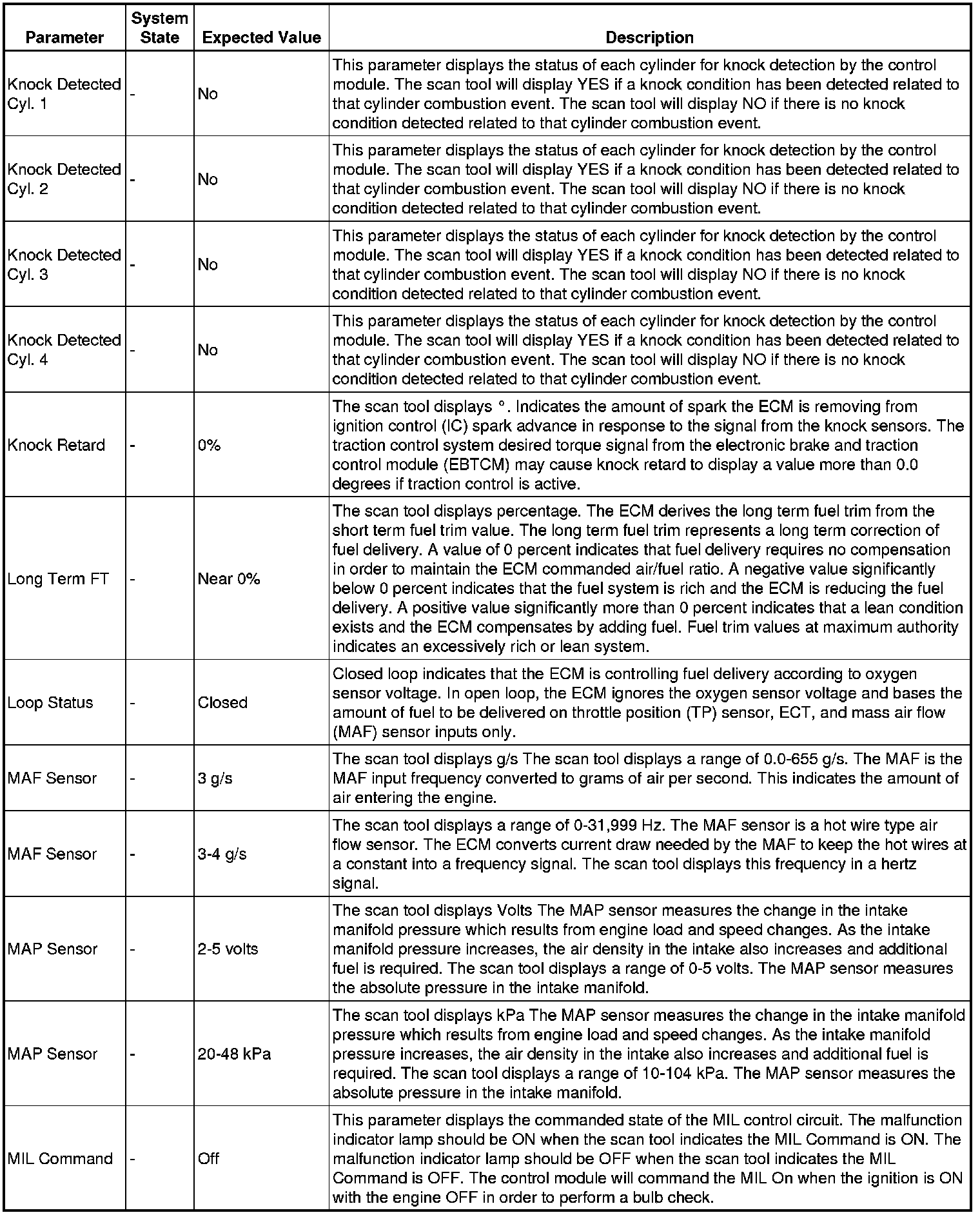 Scan tool values from a properly running engine may be used for comparison with the engine you are diagnosing. The Engine Scan Tool Data List represents values that would be seen on a normal running engine.