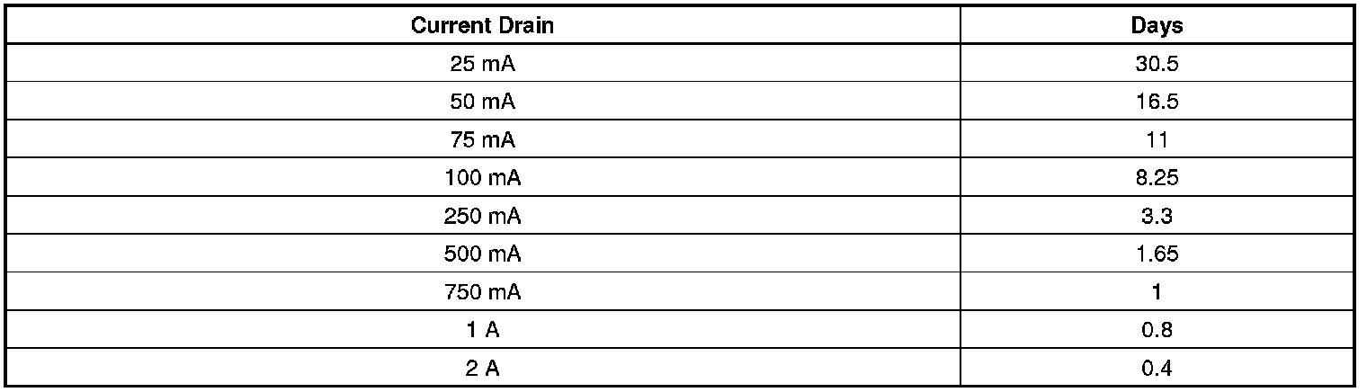 * The battery run down time will vary depending on cold cranking amperage (CCA) and reserve capacity (RC). If the CCA and RC are higher, then the battery run down time would be longer. If the CCA and RC are lower, then the battery run down time would be shorter. The graph below indicates roughly how many days a 690 CCA battery with at 110 min. RC (60.5 AH) starting at 80 percent state of charge will last with a constant current draw until it reaches 50 percent state of charge. Differences in battery rating and temperature will affect the results.