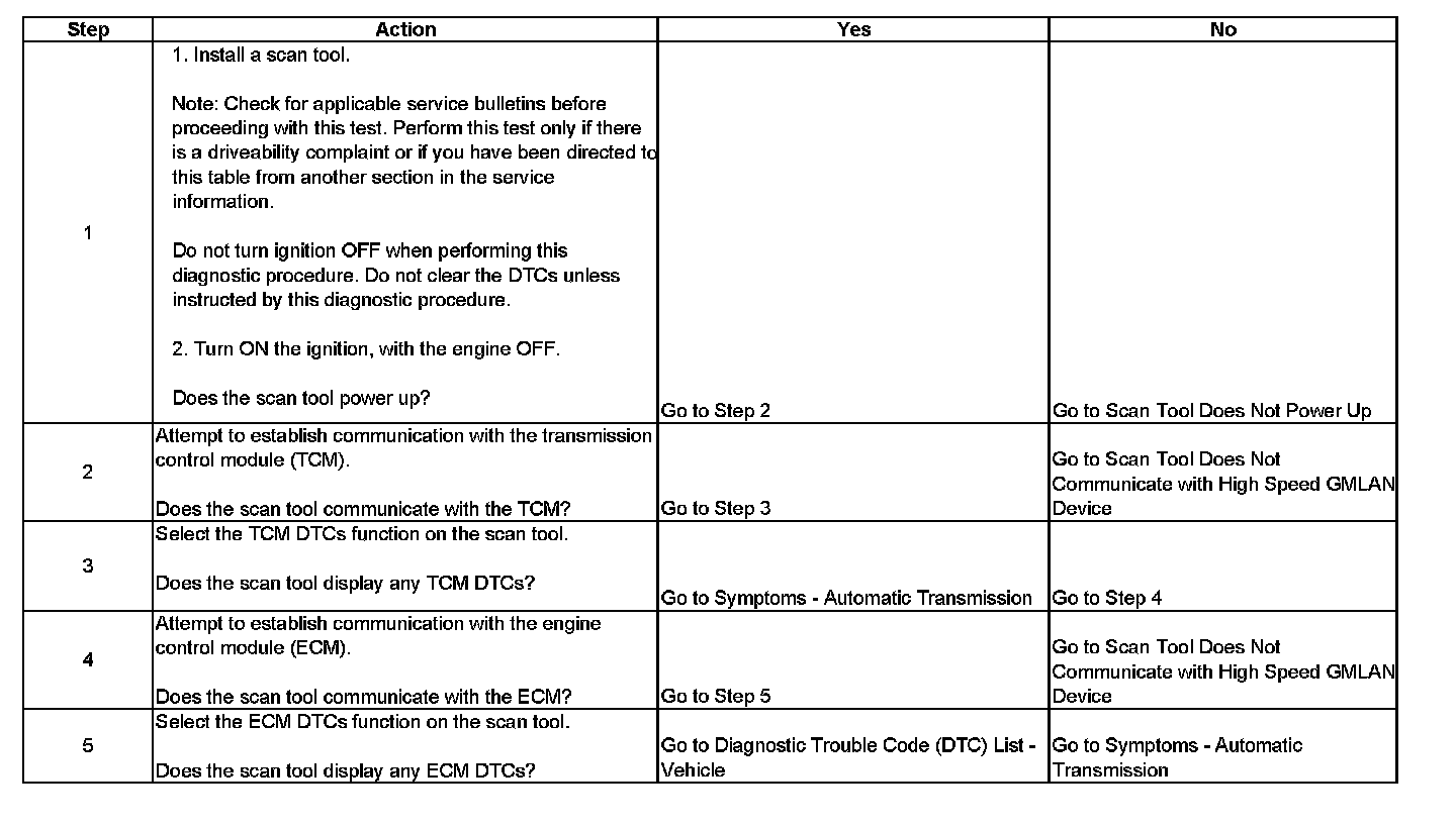 The Diagnostic System Check - Automatic Transmission is an organized approach to identify a condition created by an automatic transmission. The Diagnostic System check is the diagnostic starting point for an automatic transmission concern. The Diagnostic System Check directs you to the next logical step for diagnosing a transmission concern. Perform this check only if there is a driveability concern or if you have been directed here from another service information section. Follow the table to help reduce diagnostic time and help prevent unnecessary replacement of good parts.