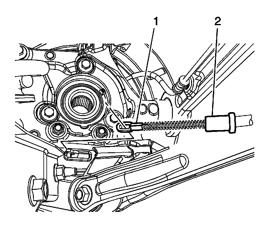 3. Install the rear park brake cable ferrules (2) to the suspension knuckles.