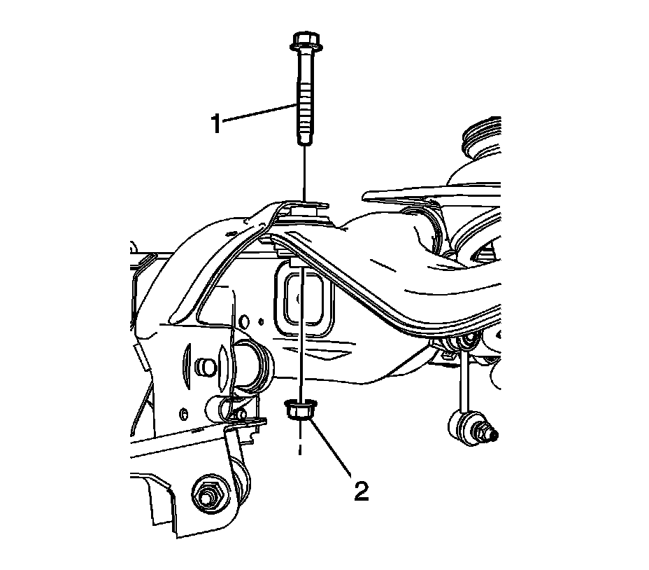 7. Remove the upper control arm bolt (1) and the nut (2) from the frame.