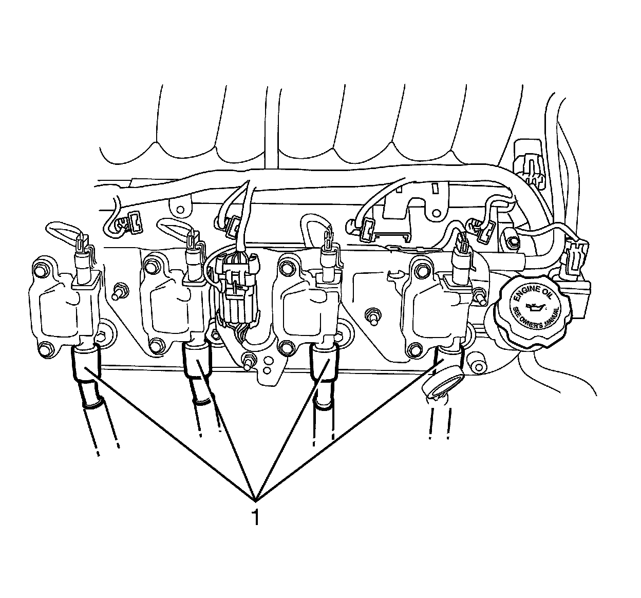 6. Disconnect the spark plug wires (1) from the ignition coils.