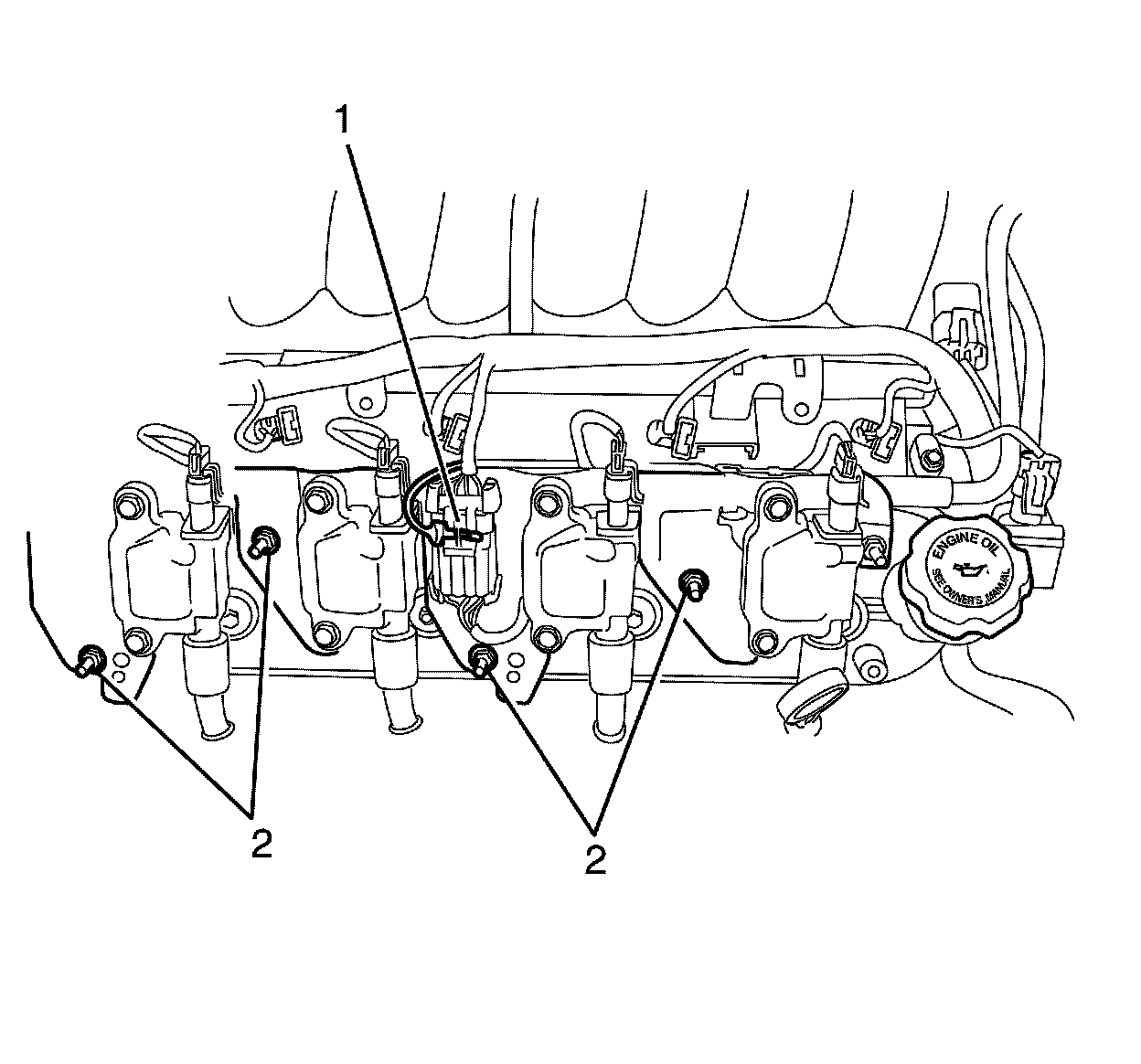 5. Install the ignition coil assembly to rocker cover retaining bolts (2) and tighten to 12 Nm (106 lb in).
