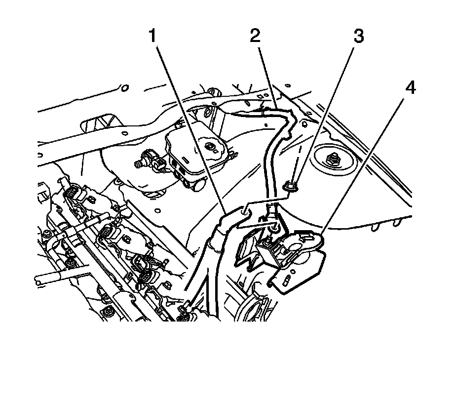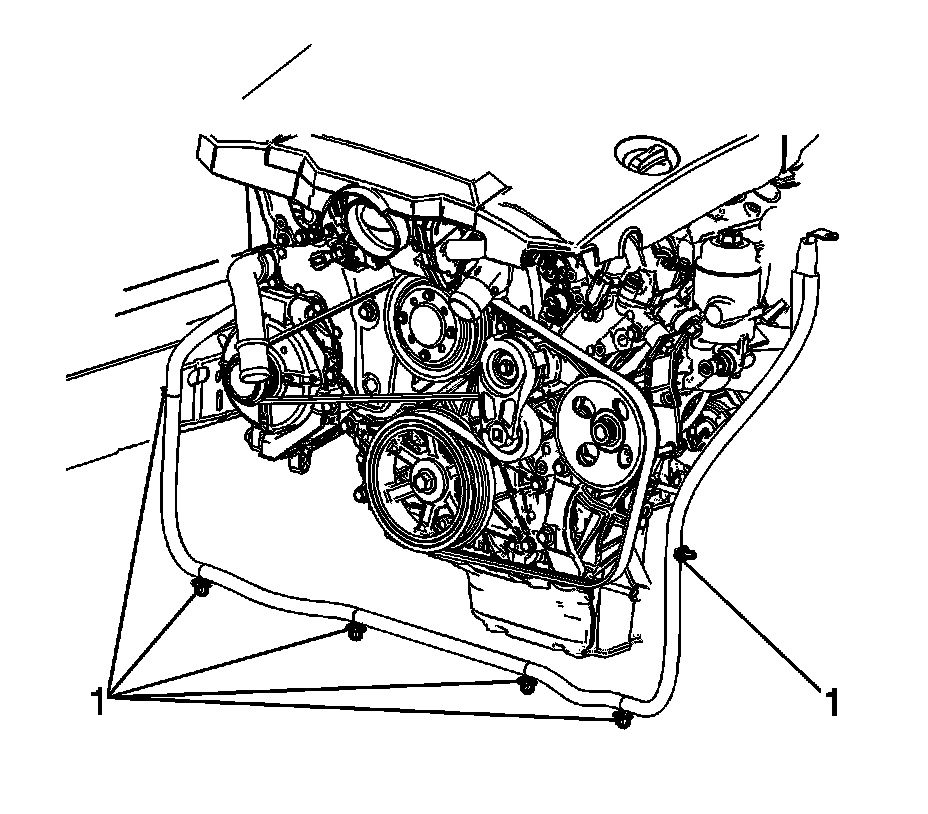 1. Fasten the engine harness and the battery positive cable to the engine compartment with the harness retainers (1).