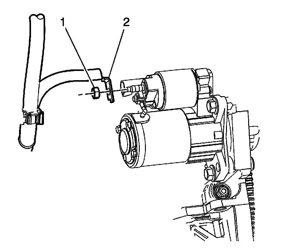 8. Remove the battery positive cable nut (1) and the battery positive cable terminal (2), from the starter.