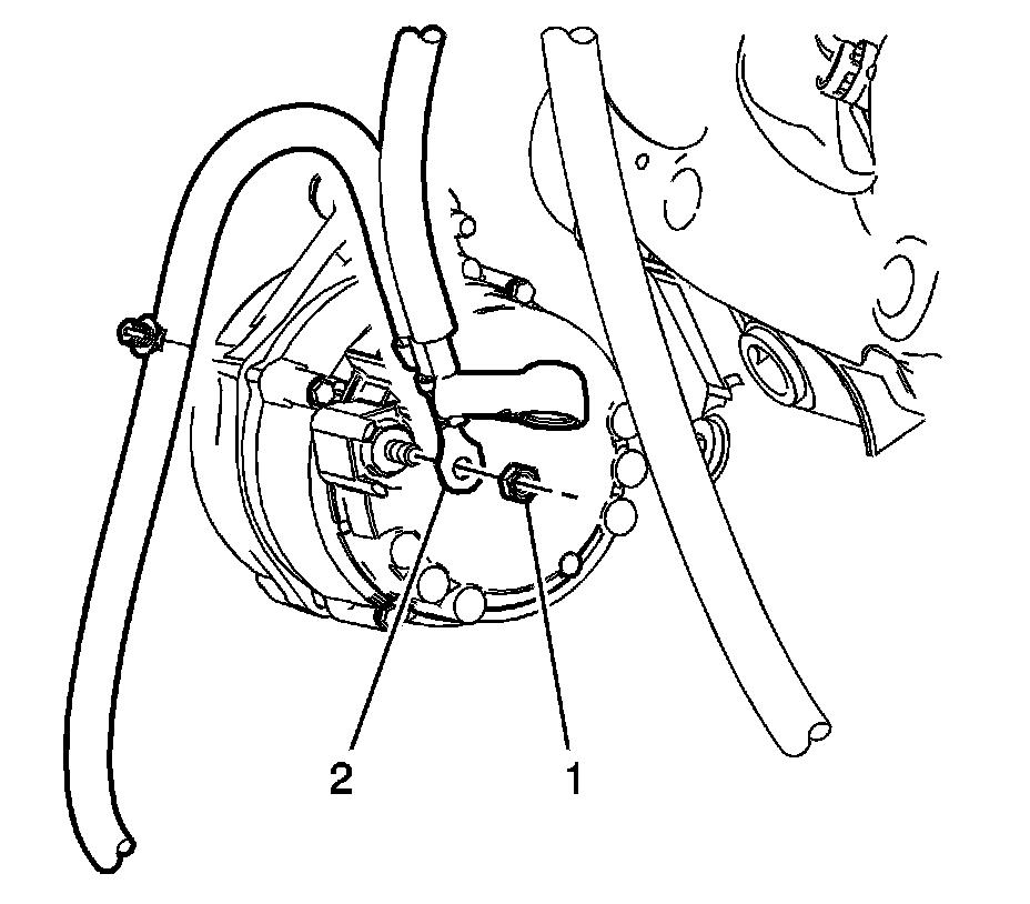 9. Remove the battery positive cable generator nut (1) and the battery positive cable terminal (2), from the generator.