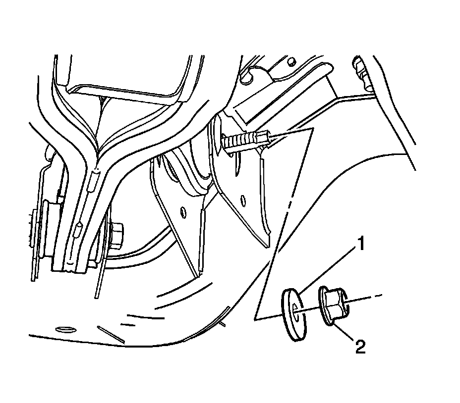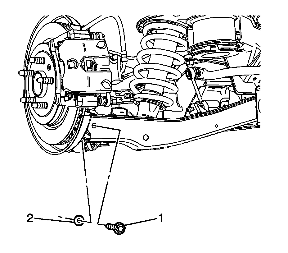 7. Remove the rear lower control arm bolt (1) and the washer (2).