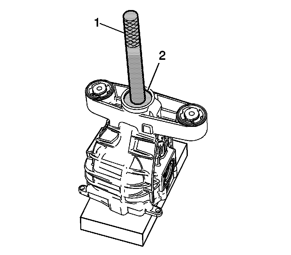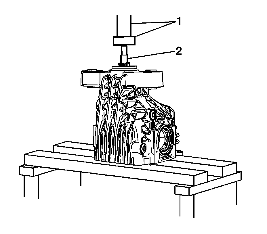 4. Using a hydraulic press and a block of wood (1), remove the pinion gear (2).