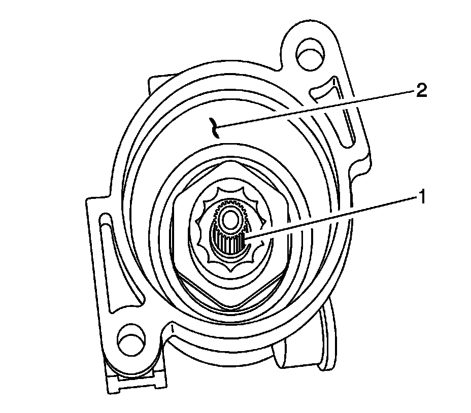 9. Use a lint free cotton cloth or equivalent in order to remove all remaining lubricant from the steering column worm shaft spline (1) and the steering column housing (2).