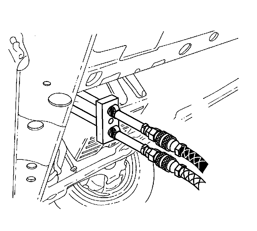 1. Connect the J 45096-30 - cooler flush adapter (1) to the vehicle transmission oil cooler supply and return lines at the transmission.
