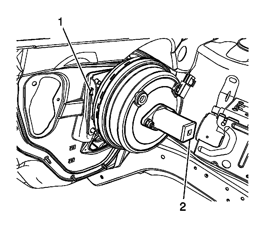 11. Levering against the inboard power vacuum brake booster stud, press the vacuum power brake booster locking tab (1) and rotate the J-22805-B - Brake Booster Holder (2) counter clockwise.