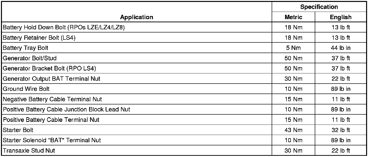 Starting and Charging: Specifications